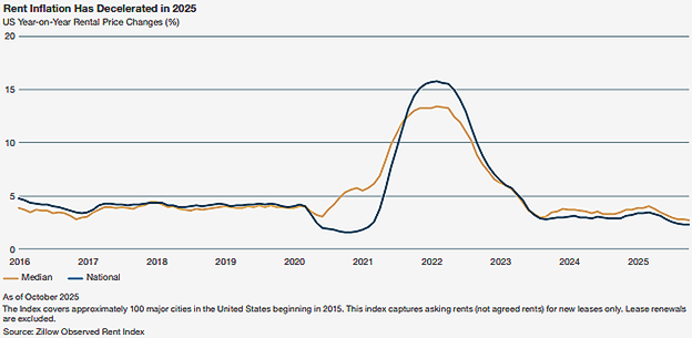 One encouraging development is housing. Rent growth has cooled meaningfully, and this historically feeds into broader inflation measures with a lag. If that trend persists, it could help offset upward pressure from tariffs and input costs.