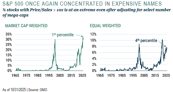 One reason caution feels appropriate today is valuation. A meaningful share of U.S. market capitalization trades at elevated multiples, driven largely by a narrow group of mega-cap technology companies. These are high-quality businesses, but markets become more fragile when leadership narrows and expectations rise too far, too fast.